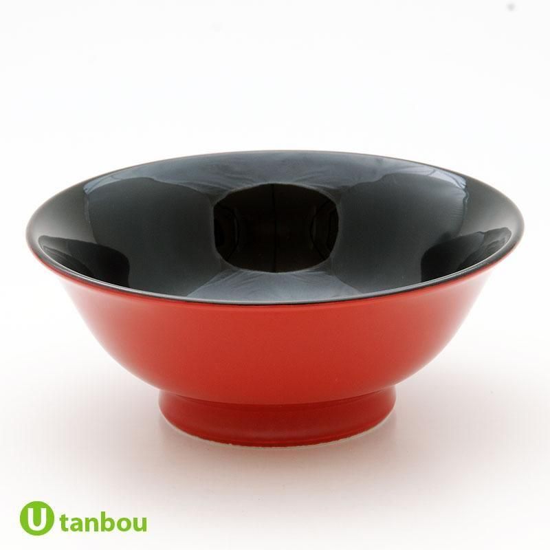 外側は鮮やかな赤、内側は黒のツートンのラーメンどんぶり。