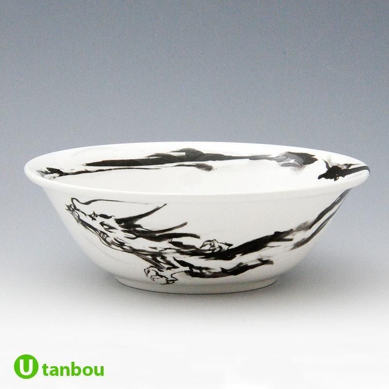 迫力のある龍の丼。墨絵風の龍の絵のラーメン丼です。